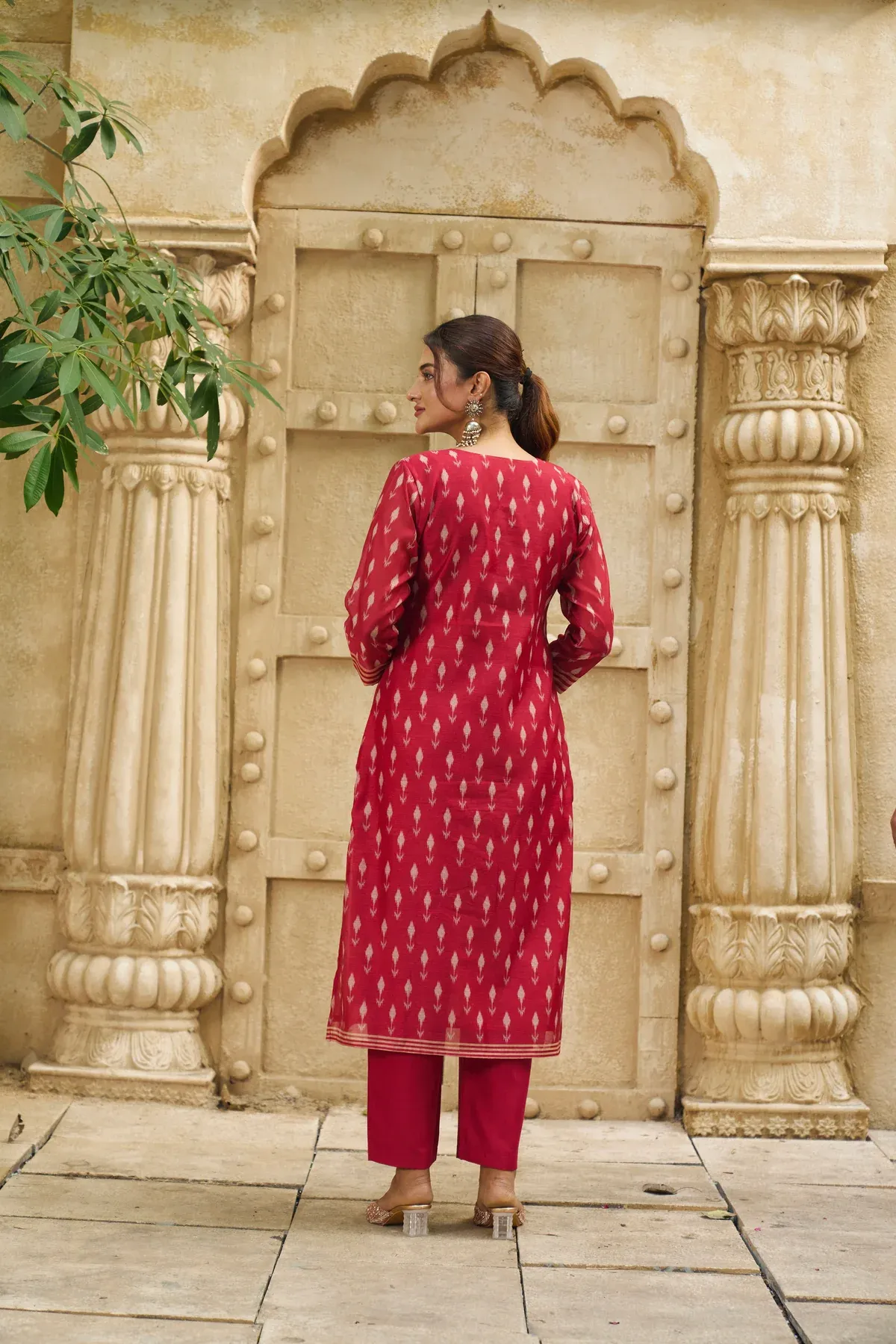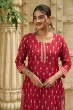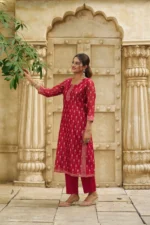 This elegant suit set is made from soft cotton silk with a pure mul lining for comfort. The kurta stands out with its Krishna–Radha artwork, enhanced by subtle button detailing on the neckline. Paired with straight-fit trousers and a matching dupatta, this ensemble beautifully blends traditional artistry with contemporary grace—perfect for festive gatherings